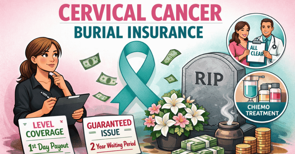 Insurance companies offer “Guaranteed Issue” burial insurance to individuals currently undergoing treatment for cervical cancer, regardless of the stage. These policies do not require medical exams or health questions, meaning you cannot be denied based on your cancer status. Because the insurer takes on a higher risk, these plans feature a standard two-year waiting period where a natural death results in a refund of all premiums plus interest, though accidental deaths are covered in full from day one.